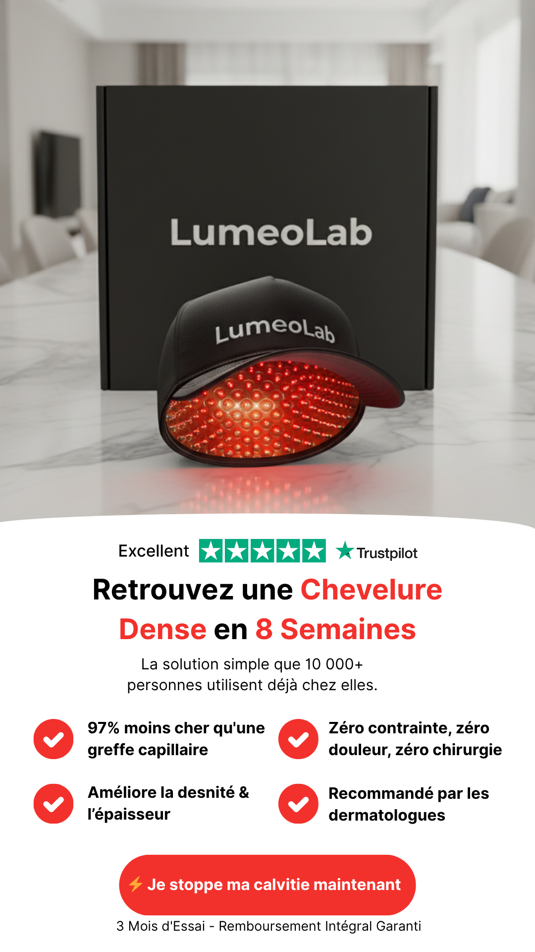 LumeoCap utilise la technologie LLLT (Low-Level Light Therapy), approuvée par la FDA américaine et soutenue par plus de 40 ans de recherche scientifique. Les études cliniques publiées dans des revues médicales de référence montrent une augmentation moyenne de 43% de la densité capillaire après 12 semaines. Ce n'est pas un gadget - c'est un dispositif médical reconnu utilisé dans les cliniques dermatologiques du monde entier. De plus, notre garantie de 7 mois vous protège : si ça ne fonctionne pas pour vous, vous êtes intégralement remboursé.